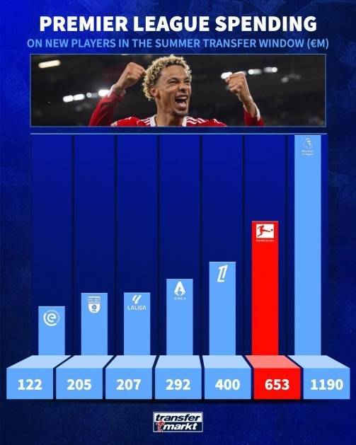 英超今夏引援转会费去向:联赛内部11.9亿,德甲6.53亿,法甲4亿